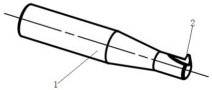 如圖1-2所示,一種整體硬質(zhì)合金刀具,包括圓柱形的刀具本體1和刀尖2,刀具本體1和刀尖2由硬質(zhì)合金制成,刀具本體1左側為圓柱形、右側為錐形,錐形直徑不大于圓柱形直徑。